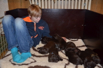 Am Anfang dieser Woche haben die Kleinen wieder einen großen Entwicklungsschritt gemacht. Ihre Augen und Ohren sind jetzt geöffnet, sie könne sich hinsetzen und auf wackligen Beinchen durch die Wurfkiste schwanken. Neugierig wird jetzt alles beäugt - auch außerhalb der Wurfkiste. Dank der speziellen Konstruktion unserer Welpenbox können unsere Kleinen sicher aufgehoben das Drumherum ihrer Behausung nicht nur riechen und hören sondern auch sehen. Da diese bei uns im Wohnbereich unseres Hauses steht, sammeln die kleinen Flattis jetzt bereits viele Eindrücke. Vorausgesetzt sie trinken oder schlafen nicht gerade... Auch die Lautgebung hat sich deutlich verändert. Aus dem leisen “muff muff” ist inzwischen ein leises Bellen geworden. Unsere Kinder freuen sich besonders über diese Fortschritte - sie dürfen jetzt immer häufiger zu den Kleinen nicht nur zum Beobachten, sondern auch zum Kuscheln!